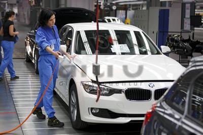 - Wirtschaft Unternehmen BMW AG Group Bayerische Motoren Werke Aktiengesellschaft Motorenwerke Werk Regensburg Produktion Fahrzeugproduktion Kraftfahrzeugproduktion Kfz-Produktion Auto-Produktion 3er weiß weiss Produktionsstart 2012 BMW-Mitarbeiter BMW-Mitarbeiterin Frau Fließband Fließbandarbeit Endkontrolle Qualitätsprüfung Themen BMW AG
