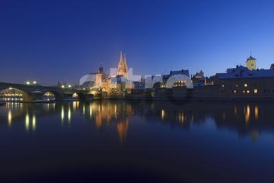 architecture building historical bridge season winter Regensburg town city view historic center centre old Steinerne Brücke stone St. Peter’s cathedral tower towers steeple steeples Amberger Stadel Salzstadel Donau Danube river snow evening dusk nightfall subjects building historical