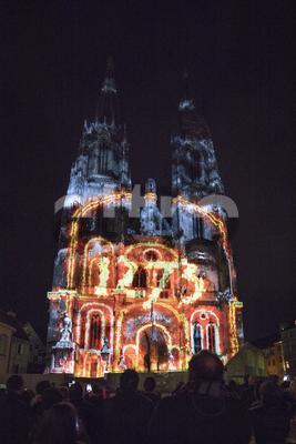 festival festivity jubilee Regensburg city view town Historical cathedral illumination lighting system light show “La cathédrale magique“made by „Spectaculairey“ west facade St. Peter's Cathedral tower towers cuase occasion reason of 150th anniversary end buidling the chathedral crowd dusk twilight night subjects festivitiy/festival/celebration