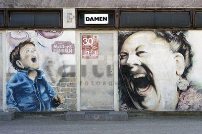 - Kunst Dekoration Bunt Graffiti Grafitti Wand Mauer Wandmalerei Airbrush Sprayer Spraydose Vandalismus Fest Kirmes Dult lachen lachend Kind Junge Bub Zuckerwatte Spass Freude Dame Damen Frau Seniorin Toilette Toiletten Themen